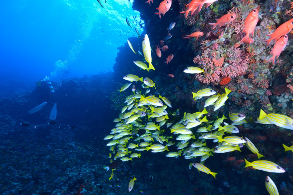 蓝角区地势独特,海底的珊瑚半岛由顶部30米深处急斜至50米深海中,该区的垂直海墙则急冲至3000米水深之下,蔚为奇观。此处水流急速多变,再加上地势是伸展至大海之中,因此该区聚集了不少鱼类,每次潜水都会带来不同的新感受。